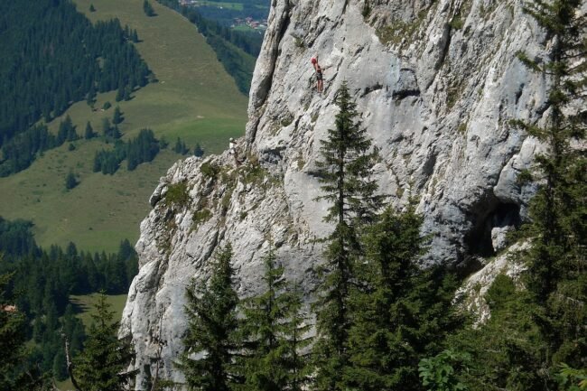 Die Kampenwand ragt 1669 m in den Chiemgauer Alpen empor, geprägt von Wettersteinkalk aus der Trias.